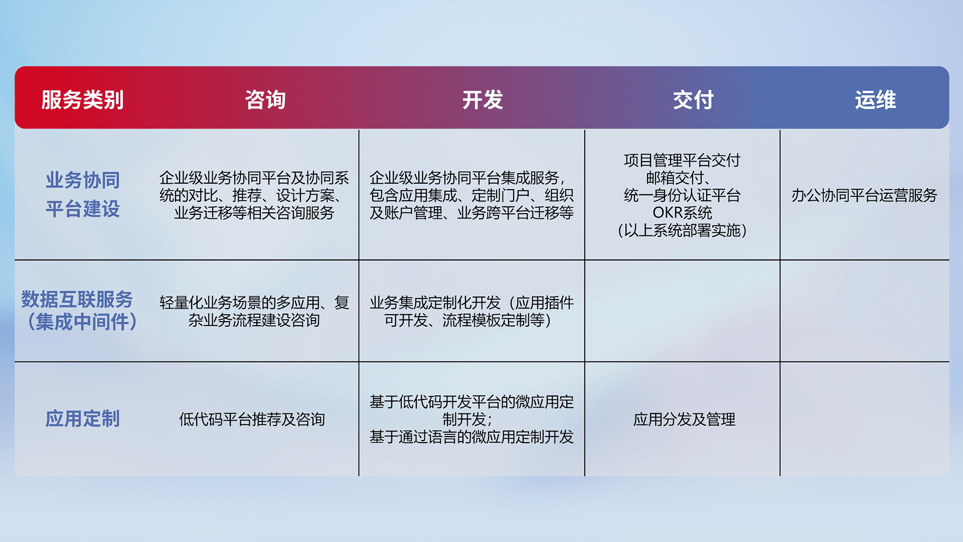 针对钉钉、、、企微、、、、IDaas等平台级产品提供产品的规划、、、、方案、、、、交付、、、定制化开发等服务,,,,实现如统一协同办公、、、、智能客户服务、、、混合会议管理、、智能数据查询、、、等业务场景,,,,实现数字化转型。。。。