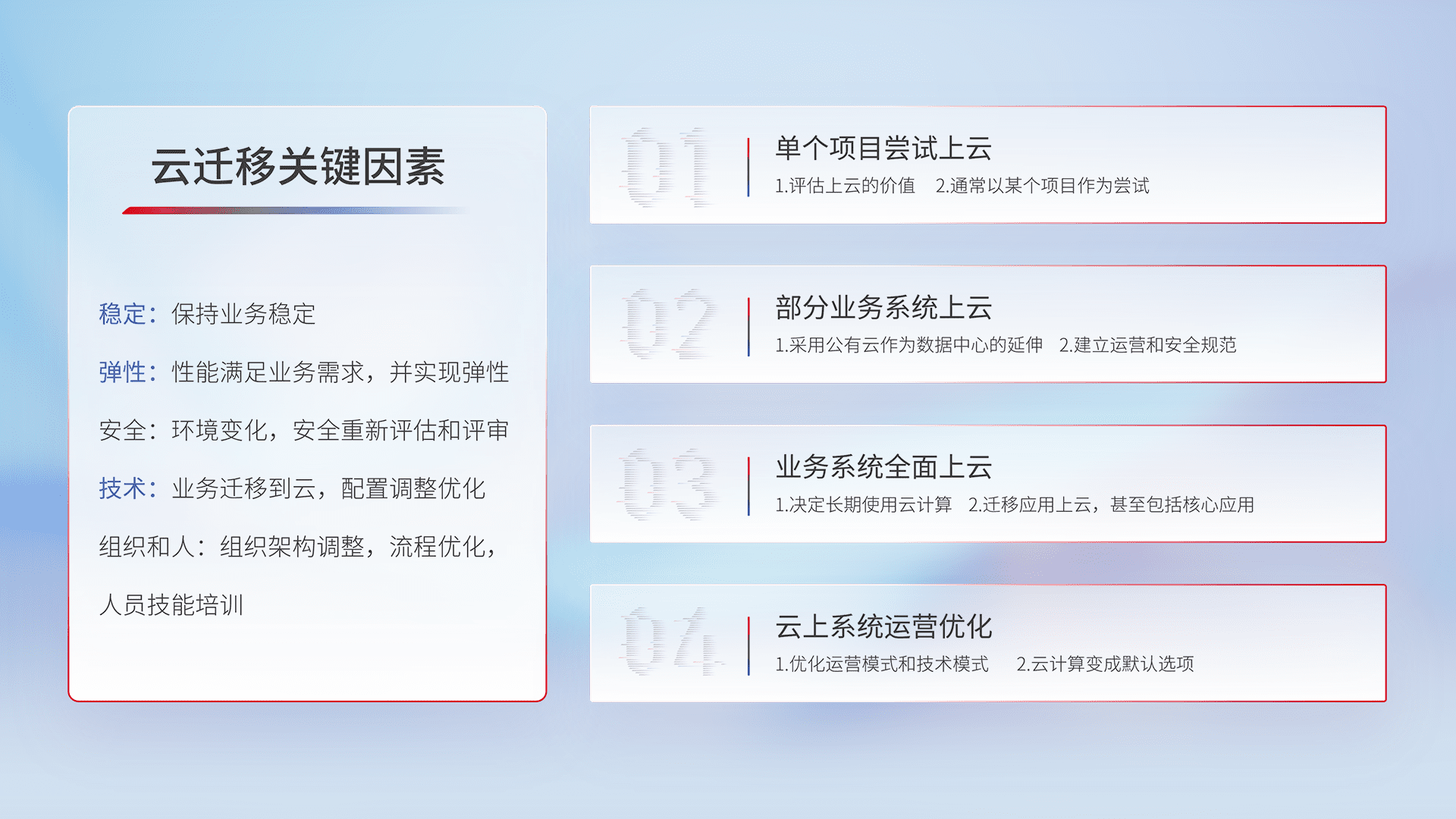 结合实际业务,,从规划设计、、、云平台选型、、、、云原生改造、、、数据迁移、、、集成交付,,,,迁移全过程为客户识别最佳上云路径,,,,做好风险识别管理,,,设计网络架构、、身份权限、、、、安全审计合规、、、操作审计、、、日志审计、、、、监控告警策略、、、多站点容灾设计等,,对云上基础设施进行整体规划,,,,提升IT治理水平,,,,以满足弹性、、、高可用、、、高性能的需求。。。。