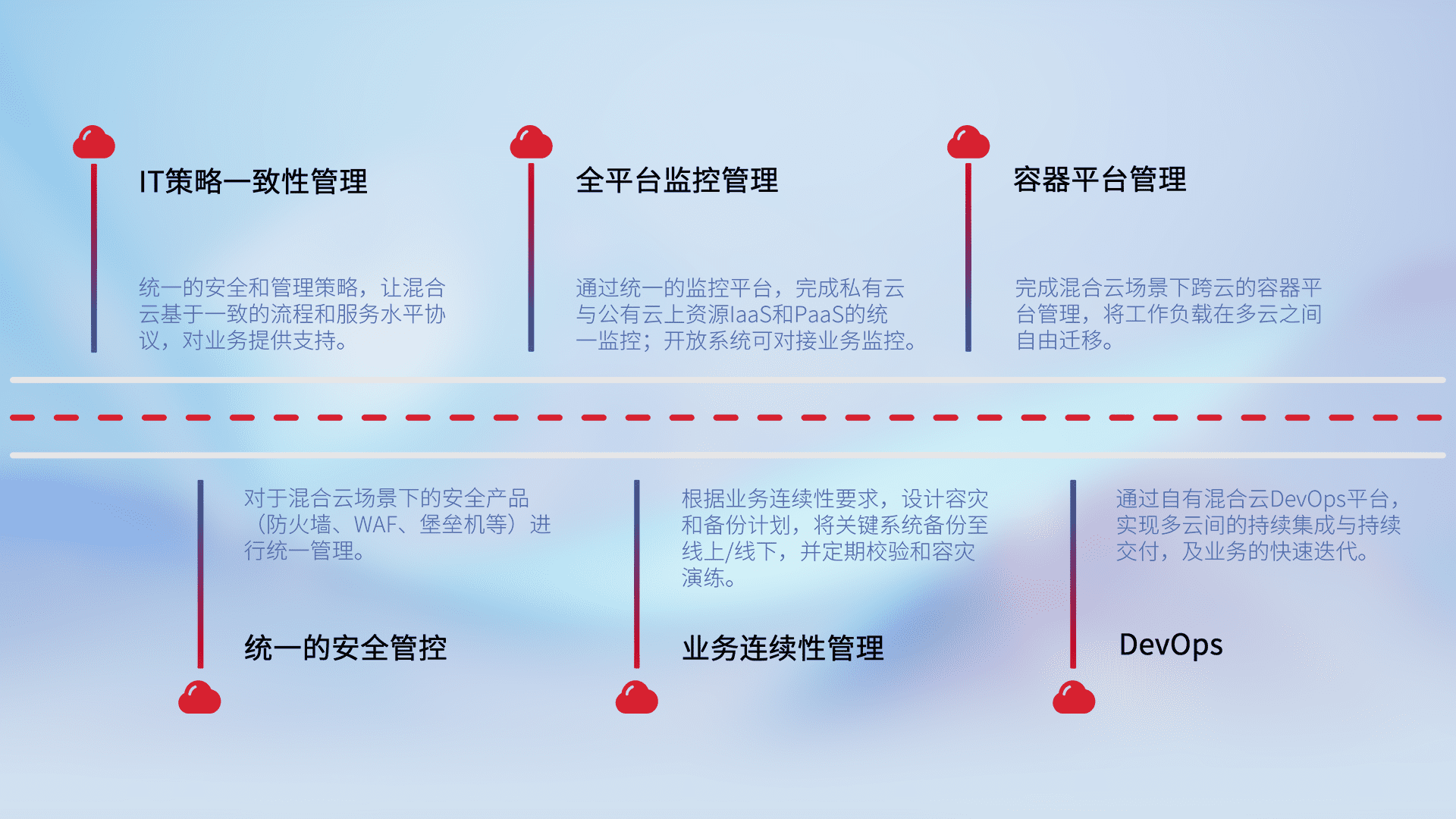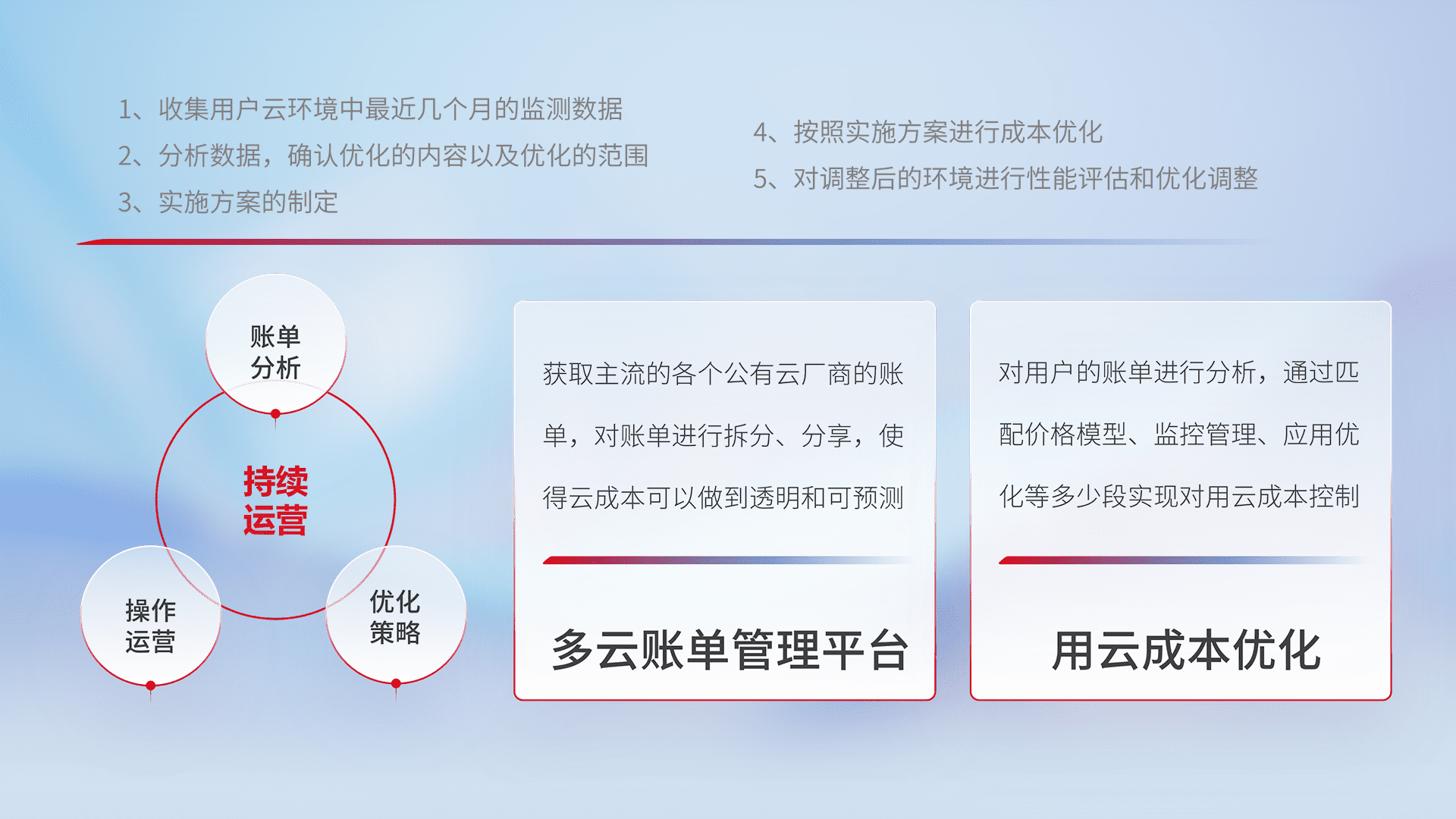 通过多云纳管,,,,以统一的资源数据模型把客户的云资源进行抽象和封装,,,,进而实现对多云资源的统一操作,,,保障云资源管理的可靠性、、、稳定性与可用性。。。量身定制化运维内容,,,配置、、开发运维、、补丁管理、、、、备份、、监控、、认证和访问管理、、、、审计和日常巡检等,,,,保障在用云过程中的可靠度,,,稳定度以及高可用率。。。
